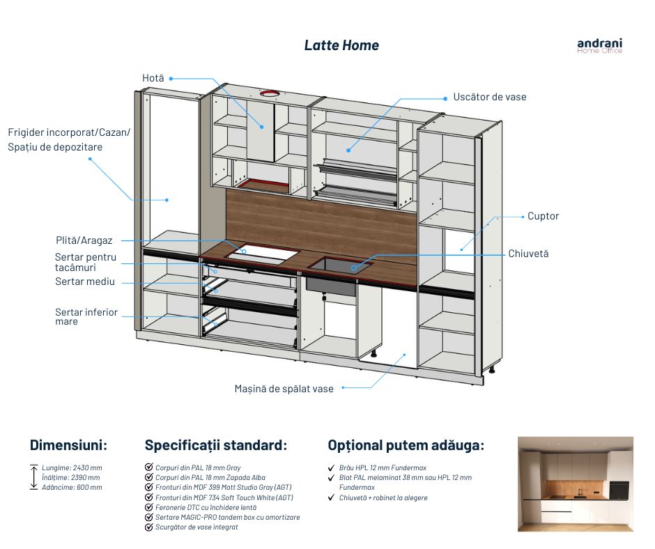 Disponibilitatea, prețul și caracteristicile produsului Bucătărie de serie LATTE HOME trebuie confirmate împreună cu consultanții Andrani Home Office.