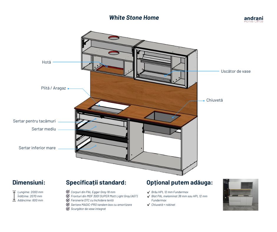 Наличие, цена и характеристики серийной кухни WHITE STONE HOME должны быть уточнены у консультантов Andrani Home Office.