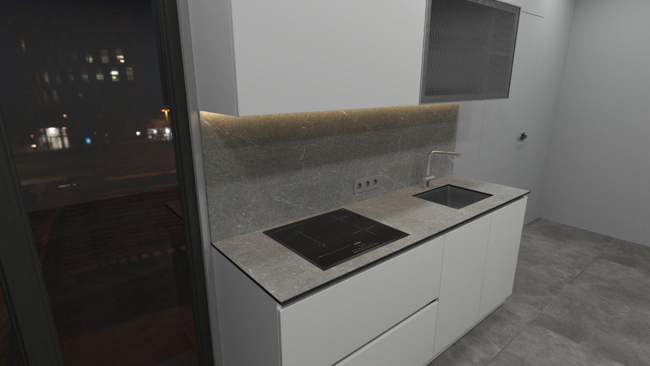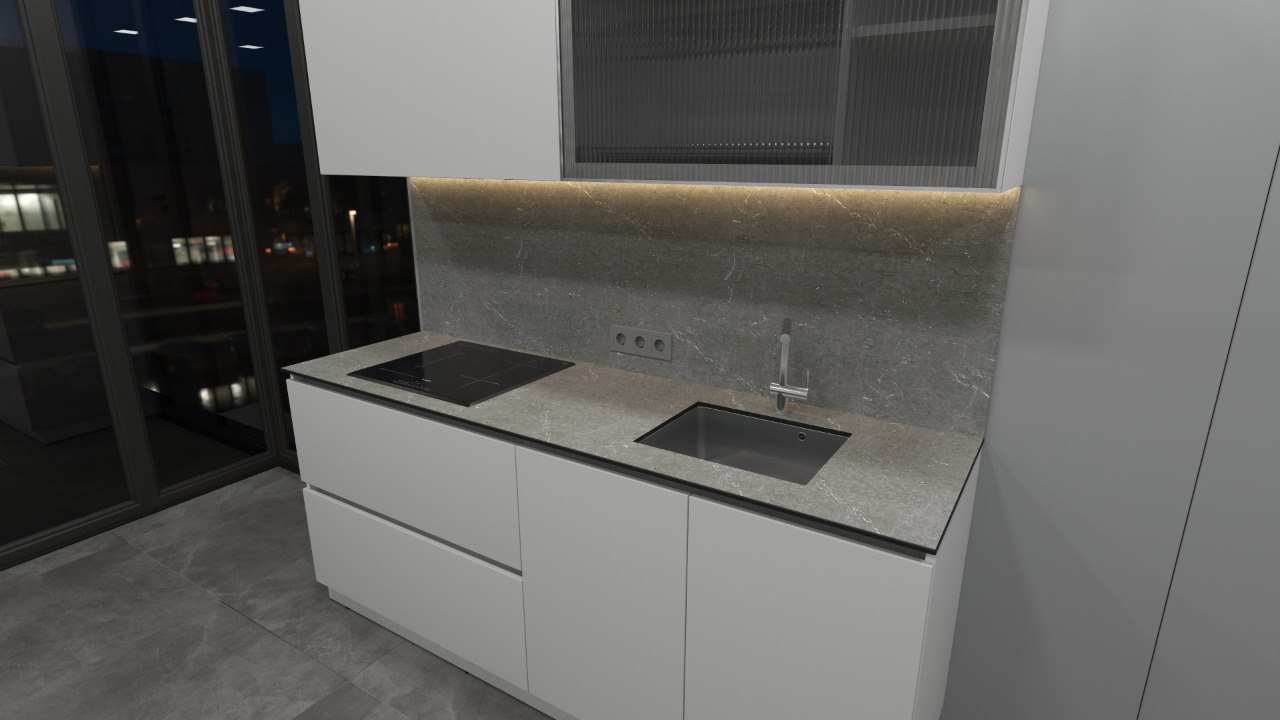 Кухня White Stone Home впечатляет своей минималистичной элегантностью, сочетая матовый белый и сатиново-серый оттенки для современного и утончённого вида.